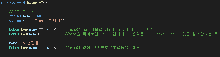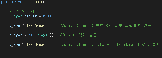 위의 예제와 같이 왼쪽의 값이 null일 때는 null이 반환되므로 TakeDamage()를 실행하지 않지만