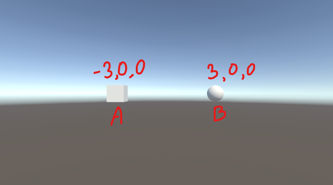 ● A의 월드 좌표는 -3, 0, 0 B의 월드 좌표는 3, 0, 0 입니다.