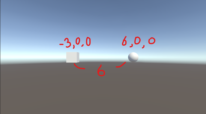 ○ A 오브젝트의 -3, 0, 0 으로부터 3, 0, 0 까지의 거리는 6, 0, 0 이기 때문